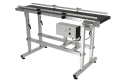 Szíjas léptetőmotoros, 250mm x 1800mm-es acél pályatestű, rozsdamentes állítható lábú szállítószalag